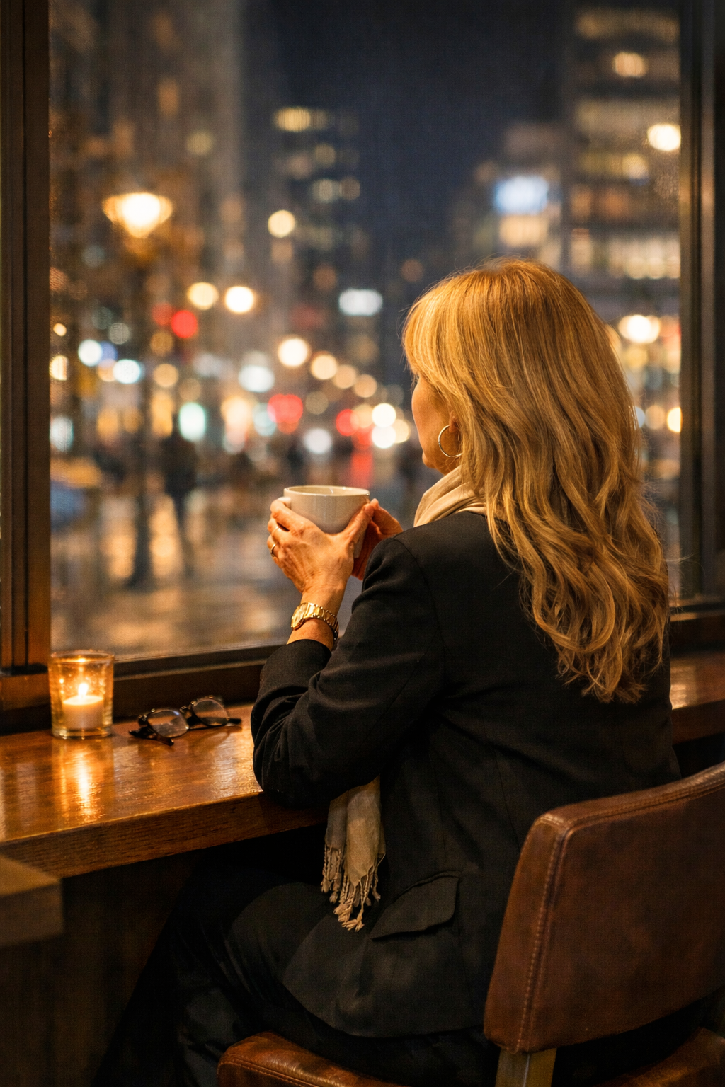 夜のカフェで、